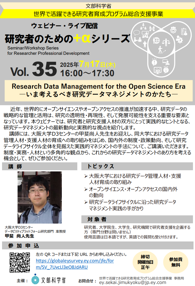 講師には、大阪大学D3センターの甲斐尚人先生をお迎えし、同大学における研究データ管理人材・支援人材の育成への取り組みをはじめ、国内外の制度・政策動向、そして研究データライフサイクル全体を見据えた実践的マネジメントの手法について、ご講演いただきます。制度・実務・人材という多角的な観点から、これからの研究データマネジメントのあり方を考える機会として、ぜひご視聴ください。