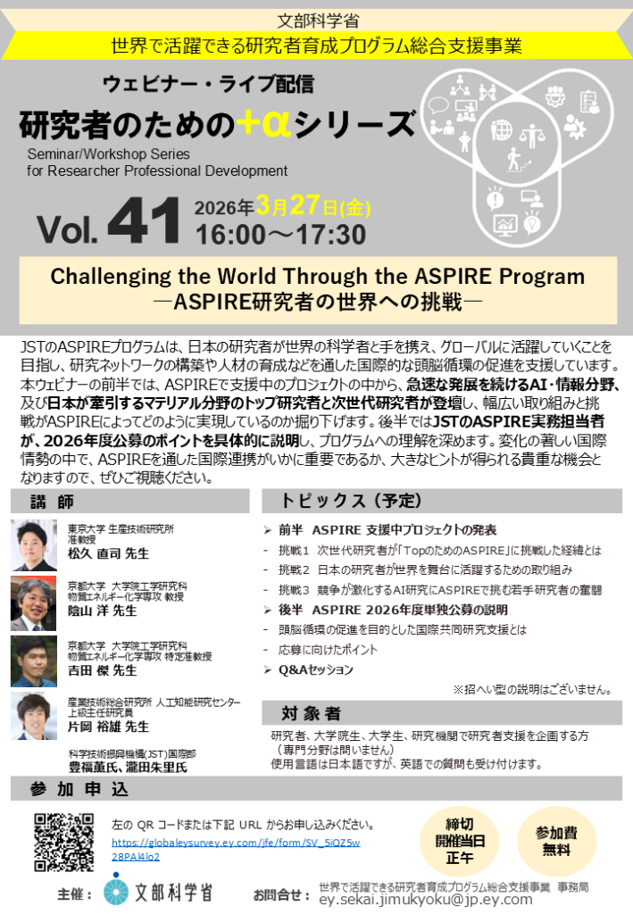 JSTのASPIREプログラムは、日本の研究者が世界の科学者と手を携え、グローバルに活躍していくことを目指し、研究ネットワークの構築や人材の育成などを通した国際的な頭脳循環の促進を支援しています。本ウェビナーの前半では、ASPIREで支援中のプロジェクトの中から、急速な発展を続けるAI・情報分野、及び日本が牽引するマテリアル分野のトップ研究者と次世代研究者が登壇し、幅広い取り組みと挑戦がASPIREによってどのように実現しているのか掘り下げます。後半ではJSTのASPIRE実務担当者が、2026年度公募のポイントを具体的に説明し、プログラムへの理解を深めます。変化の著しい国際情勢の中で、ASPIREを通した国際連携がいかに重要であるか、大きなヒントが得られる貴重な機会となりますので、ぜひご視聴ください。