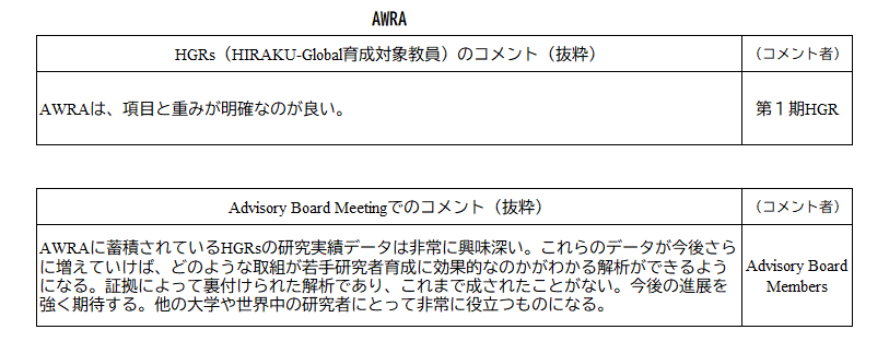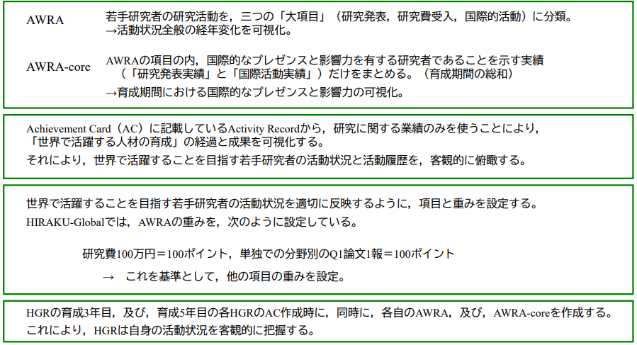 - 育成開始後3年目、5年目に各フェローのAWRA及びAWRA-coreを、HIRAKU-Global Officeが作成