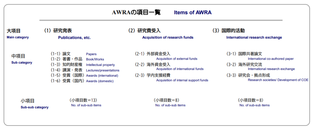 - AC(Achievement Card)に記載しているActivity Recordから研究に関する業績のみを使用し、「世界をめざす研究活動指標(英語名:Aspiring World-Class Researcher’s Activity Indicator:AWRA)」を構築