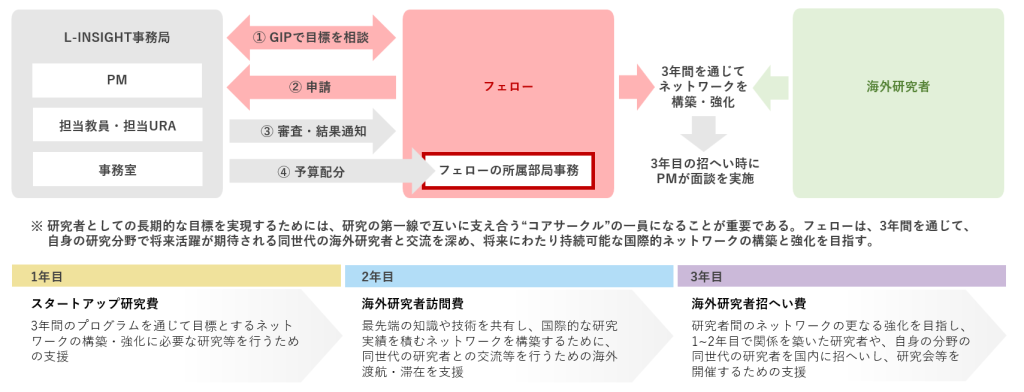 - L-INSIGHT事務局 5-6名(PM・事務・担当教員・URA)、フェローが所属する部局事務担当者・検収担当者など、フェロー