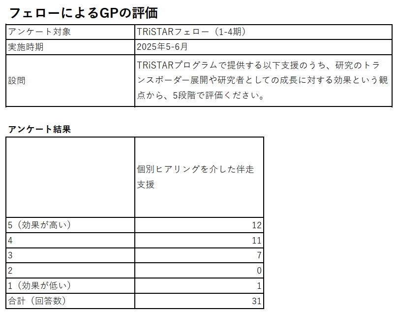 また、TRiSTARフェロー(若手研究者)15名にトランスボーダー展開や研究者としての成長に対する効果という観点から5段階評価を受けた結果、「個別伴走支援」の評価は平均4.06点と高評価であった。