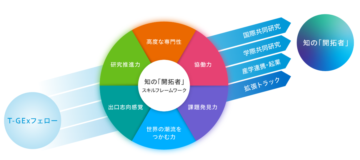 T-GExでは、「知の『開拓者』スキルフレームワーク」として、知の開拓者に必要な6つのコンピテンシー(高度な専門性、協働力、課題発見力、世界の潮流をつかむ力、出口志向感覚、研究推進力)を定めています。研究成果エキシビションは、これら6つのコンピテンシーを総合的に向上させるものであると当初から考えていました。